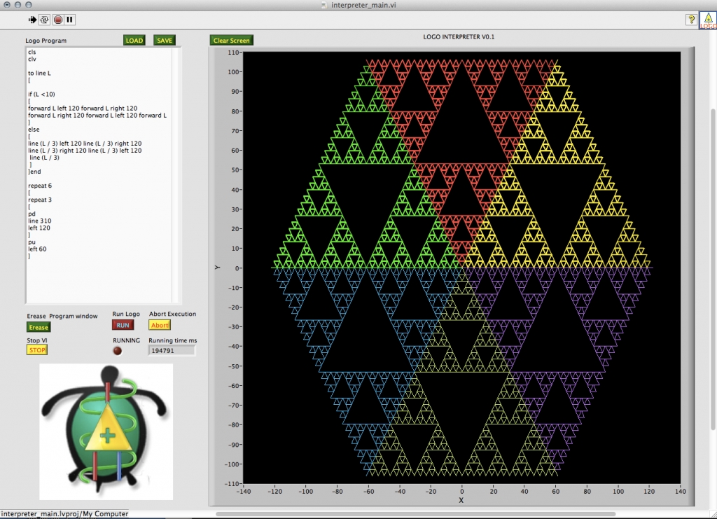 Main window of the Labview LOGO interpreter with code and result of run.