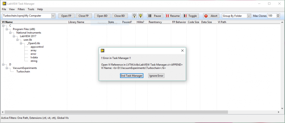I'm trying to use LVTM to debug an issue I have with, probably, stale references to asynchronous dynamically launched VIs. To stress test the problem, I open LVTM, open my project, launch what I have to launch, and then I uncleanly choose File/Close all (this project) while the whole contraption is running. LVTM shows me then this attached unreactive almost empty tree, with an entry surviving from the aborted project. If I double-click it, I get the error dialog. How can I help to debug LTVM (and my issue too?)