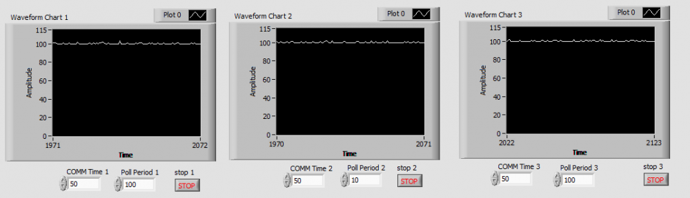 I am communicating with multiple instruments over a single serial port. These instruments are different but share a common communication protocol. Therefore, it makes sense to handle their data acquisition in separate loops. To do this, I open duplicate VISA sessions on the serial port (one for each loop). To avoid one loop interrupting the other's serial transaction, I am trying to use VISA locking: - I would expect one loop to take control of the serial port while the others wait in some sort of FIFO queue (implemented within the VISA lock primitive). - I would expect that if the timeout of the locks were set to 10 seconds, and there were 3 loops, each loop executing one serial transaction that takes less than 50ms, then the VISA lock should never timeout. In reality, this is not the case. It is actually possible that one loop can starve the others by somehow holding onto the lock over multiple iterations (See figure 1). The graphs show the amount of time (in ms) spent waiting on the VISA lock per iteration of the loop. Clearly loop 2 never has to wait while loop 1 and 3 timeout after 10 seconds. Figure 2 shows a case where the loops are not starving each other but are clearly holding on to the lock over multiple iterations before releasing it. My simulation VI is attached. COMM time is the time in ms allotted to each serial transaction. Poll period is the desired execution rate (in ms) of the loop. Starvation starts to occur when COMM time is equal to poll period. Note that I am not using "VISA Lock Async" because it is NOT re-entrant and is thus only appropriate if your system only needs to use one serial port at a time. I really didn't expect this kind of behavior. So my question is, does anyone know why VISA lock has been implemented this way? VISA Lock Behavior.vi